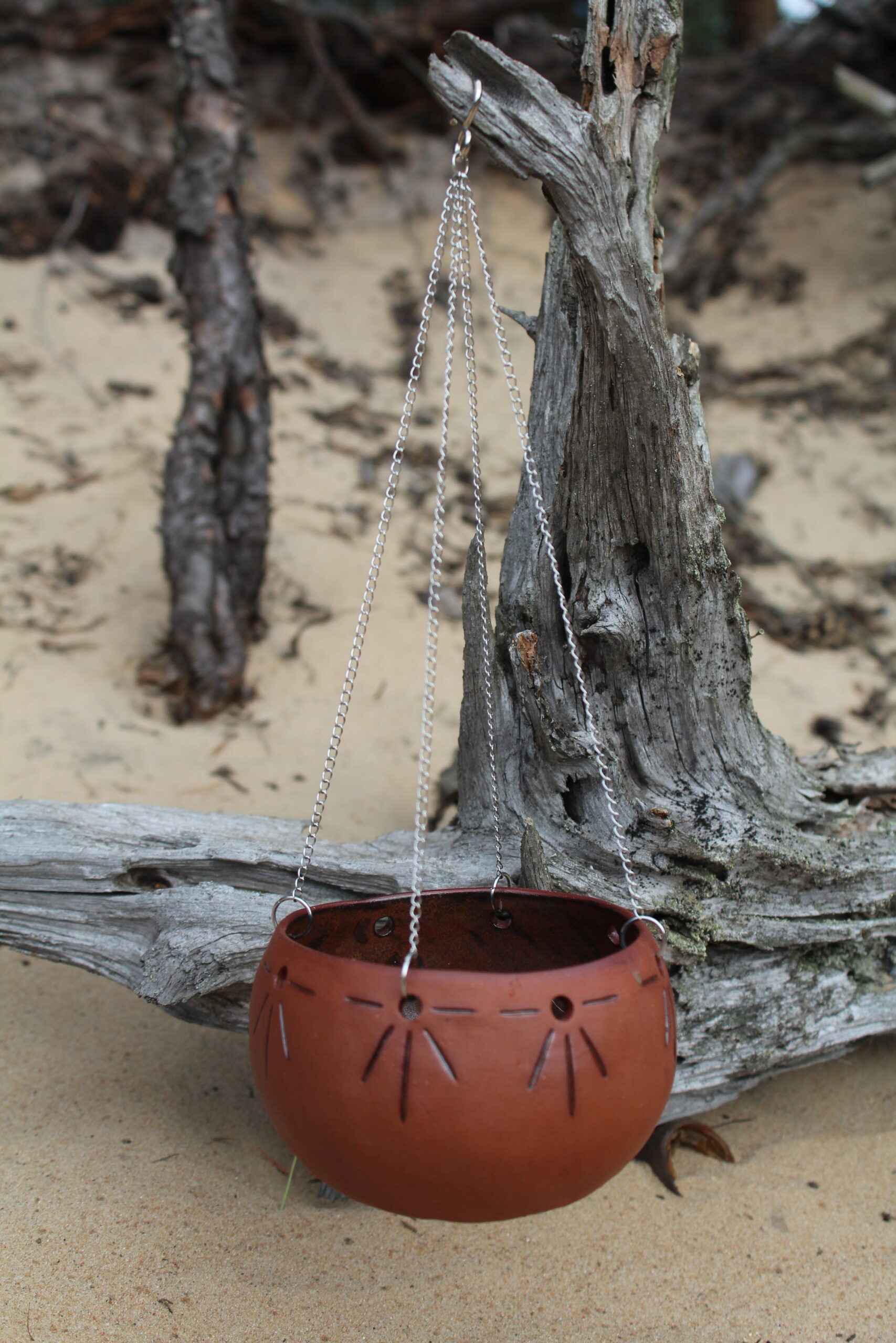 Riputatav pruunist savist, väljast glasuurimata kausike